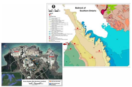 Bedrock geology of southern Ontario showing the location of boreholes used for this study within the Bruce Nuclear site and other areas in southern Ontario (modified from []).