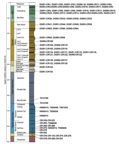 - AECOM; Itasca Consulting Canada. Regional Geology—Southern Ontario; Report NWMO DGR-TR-2011-15 R000; Nuclear Waste Management Organization: Toronto, ON, Canada, 2011. [Google Scholar]