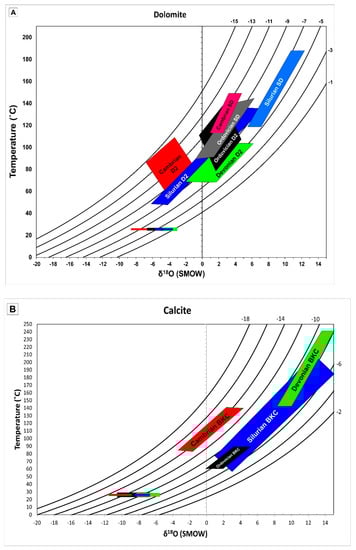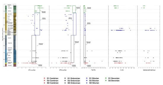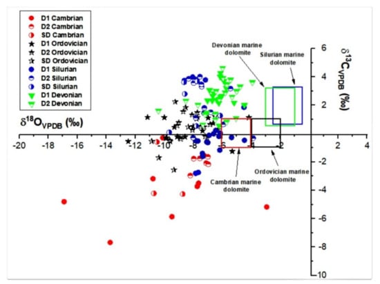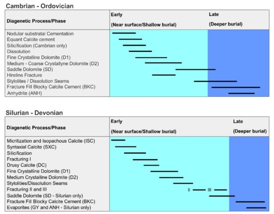 Paragenesis of the Cambrian-Ordovician formations (modified from Al-Aasm and Crowe []) and paragenesis of the Silurian-Devonian formations (modified from Tortola et al. []).