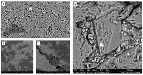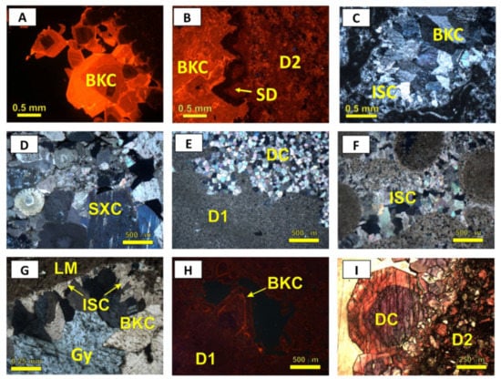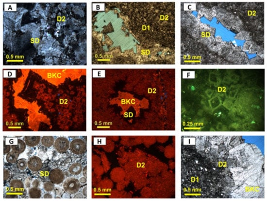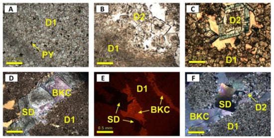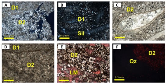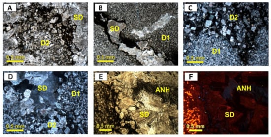 The dolomite types occur as both replacements (D) and cement (SD) (cf. [,]). According to Sibley and Gregg’s classification [] and based on petrographic characteristics (e.g., crystal size, shape, extinction, fabric, and paragenetic relationships), several types of dolomite development are distinguished. Table 1 summarizes the main types of dolomite and their petrographic and CL characteristics.
