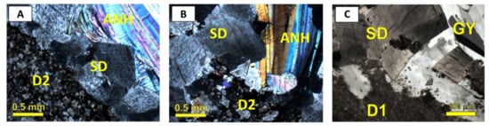 Together with the calcite and dolomite diagenetic phases reported above, silica-bearing minerals and sulfate minerals are also present in the studied successions (Figure 10).