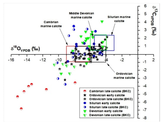 Cross plot of δ13CVPDB vs. δ18OVPDB of different generations of calcite cement of different ages. Note the overlap in many values and the negative shift of late calcite from the postulated range for respective seawater composition.