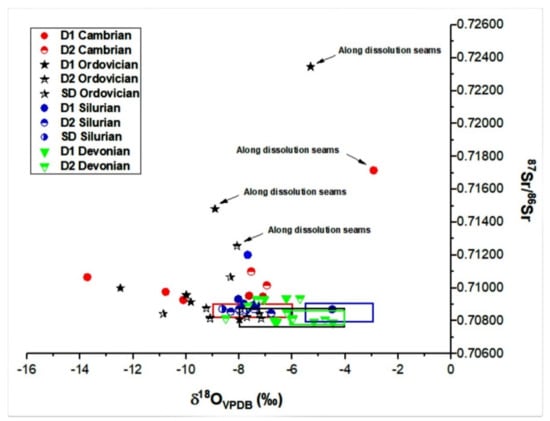 Cross plot of δ18OVPDB values vs. 87Sr/86Sr ratios of different generations of dolomite. Note the overlap in many values and the shift from the postulated values for respective seawater composition except for dolomite associated with dissolution seams.