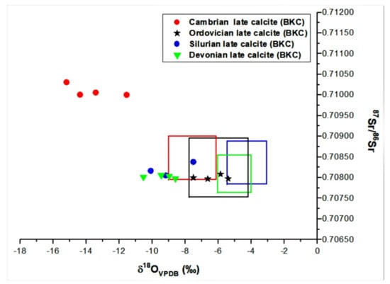 Cross plot of δ18OVPDB values vs. 87Sr/86Sr ratios of different generations of calcite cement. Note the highly radiogenic ratios in Cambrian blocky calcite.