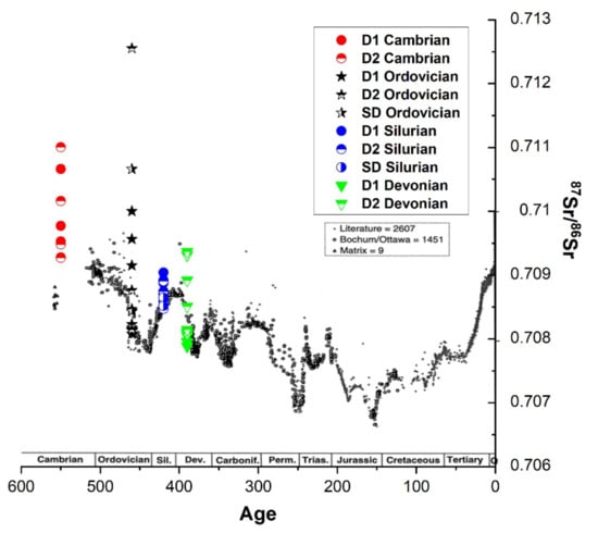 - Veizer, J.; Ala, D.; Azmy, K.; Bruckschen, P.; Buhl, D.; Bruhn, F.; Carden, G.A.F.; Diener, A.; Ebneth, S.; Godderis, Y.; et al. 87Sr ⁄ 86Sr and δ13C and δ18O evolution of Phanerozoic seawater. Chem. Geol. 1999, 161, 59–88. [Google Scholar] [CrossRef] [Green Version]