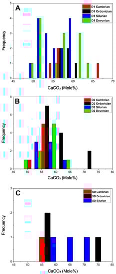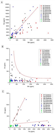 Analytical results of major, trace, and rare-earth (REE) element concentrations for the dolomites and calcites from various age groups are summarized in Table 3. All analyzed replacement and cement dolomite types are non-stoichiometric, consistently calcium-rich (average CaCO3 ranging from 54.3 to 61.8 mol% for D1 and D2, and from 57.7 to 63.3 mol% for SD, respectively; Figure 16). There are no significant differences in Mg content in zoned D2 and SD between the cores and rims, as evidenced from the semiquantitative EDX analysis. In general, Mn and Fe contents in the Cambrian and Ordovician dolomites are much higher than the Silurian and Devonian dolomites (Table 3). There is also a covariant trend between Mn and Fe for these dolomites (Figure 17). However, the average of Sr content in all dolomites does not show large variations among the investigated dolomite types (vary between 83 and 253 ppm, Table 3), but many samples from the Ordovician dolomites show high Sr content and covariant trends with Fe and Mn (Figure 17). Such a relationship is not apparent in the dolomites from other age groups.