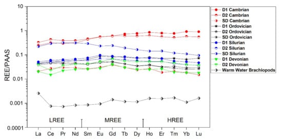 - Azmy, K.; Brand, U.; Sylvester, P.; Gleeson, S.A.; Logan, A.; Bitner, M.A. Biogenic and abiogenic low-Mg calcite (bLMC and aLMC): Evaluation of seawater-REE composition, water masses and carbonate diagenesis. Chem. Geol. 2011, 280, 180–190. [Google Scholar] [CrossRef] [Green Version]