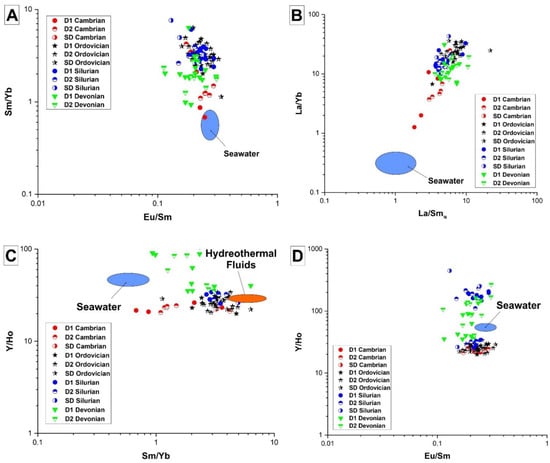 For rare-earth (REE) element analysis, samples were analyzed using external calibration, internal standard, and standard addition methods, following the procedure described in Jenner et al. []. Measured REE values were normalized to Post Archean Australian Shale (PAAS). Rare-earth element anomalies such as CeSN [(Ce/Ce*)SN = CeSN/(0.5LaSN + 0.5PrSN)], LaSN [(Pr/Pr*)SN = PrSN/0.5CeSN + 0.5NdSN)], EuSN [(Eu/Eu*)SN = EuSN/(0.5SmSN + 0.5GdSN)], and GdSN [(Gd/Gd*)SN = GdSN/(0.33SmSN + 0.67TbSN)] were calculated employing the equations proposed by Bau and Dulski []. The proportions of LREE(La-Nd) over HREE (Ho-Lu) were calculated via (La/Yb)SN ratios as proposed by Kucera et al. []. The proportions of MREE (Sm-Dy) was calculated using (Sm/La)SN and (Sm/Yb)SN ratios [] over LREE and HREE, respectively.