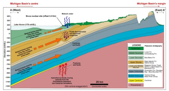 The Paleozoic sequence is separated from underlying Precambrian rocks of the ca. 1.1 Ga old Grenville orogeny by an unconformity overlain by a relatively thin Cambrian sandstone, which represents an aquifer [,]. The depositional environment of the Ordovician and Cambrian formations encompasses various facies assemblages, including supratidal, lagoonal to subtidal environments (e.g., [,]). The diverse facies changes observed in these formations were controlled by relative sea-level changes and sources of detritus, related to the regional tectonic setting during the Paleozoic [,]. In the study area, many of the Cambrian units along the Algonquin Arch (Figure 1) were absent due to arch rejuvenation and uplift during early Paleozoic times (e.g., []). Ordovician formations consist of thin, decimeter-scale, alternating shale, and carbonate beds; some of which have been dolomitized []. The Michigan Basin has been characterized by a typical tropical climate during mid to late Silurian because it was located at 25° south of the equator [] leading to the development of shallow waters reef complexes. Moreover, the Michigan Basin has been isolated and is becoming an evaporative basin in which alternation of evaporites and carbonates is deposited during the rest of the Silurian []. Conversely, in the Middle Devonian, the Michigan basin has been characterized by an extremely arid climate with consequent deposition of shallow intertidal and supratidal lithofacies such as Amherstburg and Lucas formations []. The Devonian sequences are represented by limestones, shales, dolostones, and sandstones [] with arid climate and deposition of shallow intertidal and supratidal lithofacies (e.g., Amherstburg and Lucas formations).