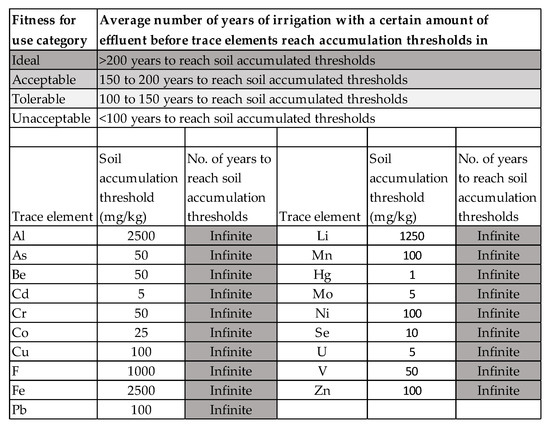 The AF effluent is very ideal for agricultural use, and it was predicted that no trace elements are expected to accumulate for >200 years of irrigation (Figure 6).