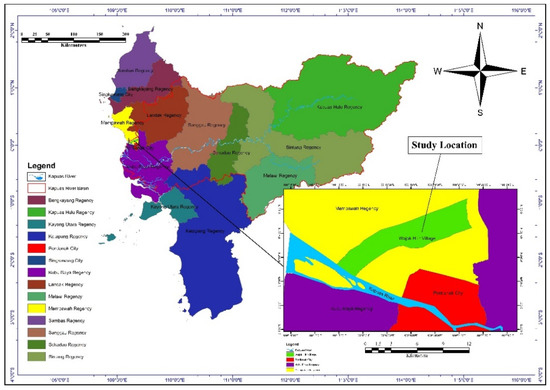 The district directly adjacent to the location of the provincial capital of West Kalimantan is the Mempawah Regency. The site of Mempawah is in the lower reaches of the Kapuas River, and it is also a coastal area in the province of West Kalimantan. The percentage of households that have access to clean water sources and proper sanitation by place of residence (SDGs 6) in Mempawah, in 2020, was 79.1% [9]. On the basis of the location and characteristics of the land, this achievement is still low, considering the very high potential of water resources in Mempawah. This percentage shows that there are management problems that require attention in this district, so it is necessary to study clean water and proper sanitation in communities, especially rural communities, in the Mempawah Regency.