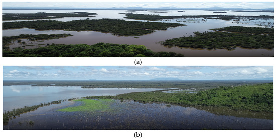 Surface water conditions at Lake Sentarum in Kapuas Hulu regency (upstream part of Kapuas River, documented on 16 June 2019). (a) Expanse of surface water at Lake Sentarum; (b) water level in average conditions.