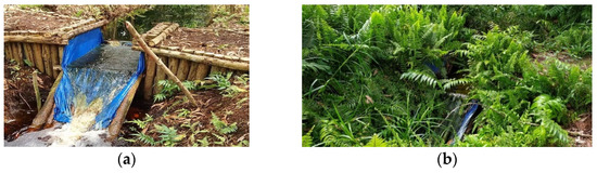 Canal blocks in the field. (a) Participatory construction of canal blocks by the community [35]; (b) canal blocks on peatland after approximately 3 years of being overgrown with plants enabling a natural canal blocking function.