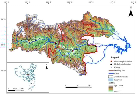 The study area is located in the upper reach of the Han River in Shaanxi Province of China, mainly including Hanzhong City, Ankang City and some counties of Shangluo City. The study area is about 51,833 km2, accounting for 82.75% of the area of the Han River basin in Shaanxi Province. According to the distribution of the river network, the study area is divided into two sections, shown by red lines in Figure 1: the upper section is the upstream catchment of Shiquan hydrological station, and the lower section is the catchment between Shiquan hydrological station and Baihe hydrological station.