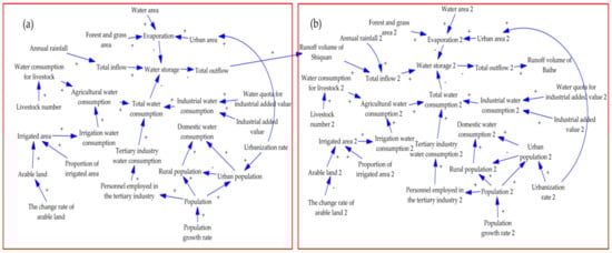 Causal loop diagram of socio-hydrological system: (a) the Upper section; (b) the Lower section.
