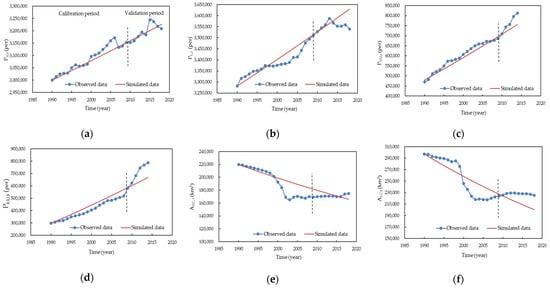 According to the causality and equation of the model, the parameters that need to be calibrated in the model include the change rate of the population (), the change rate of the urbanization rate (), the change rate of cultivated land area (), the change rate of cows (), the growth rate of industrial added value () and the water quota change rate of industrial added value (). The variables that are validated by historical data include total population (), urban population (), cultivated land area (), the number of cows (), industrial added value () and industrial added value water quota (). In addition, the equations for the numbers of pigs and sheep (,) are fitted by historical data, and there are no parameters to calibrate. The potential evaporation () and the annual precipitation are input data. The values of calibration parameters are shown in Table 3, and the evaluation results in the calibration and validation periods are shown in Table 4 and Table 5. Mean Absolute Percentage Error (MAPE), Nash–Sutcliffe efficiency coefficient (NSE) and the coefficient of determination (R2) are used to evaluate the variables simulated by the model. When NSE is 1, the simulated value equals the observed value.