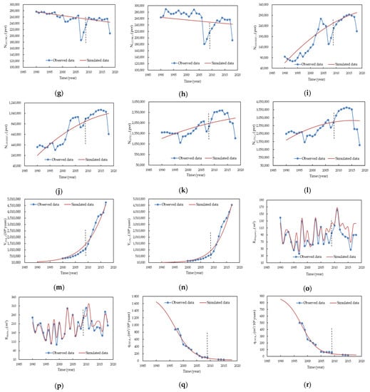Simulated and observed values of variables. (a) Population in the upper section, (b) population in the lower section, (c) urban population in the upper section, (d) urban population in the lower section, (e) cultivable land area in the upper section, (f) cultivable land area in the lower section, (g) number of cows in the upper section, (h) number of cows in the lower section, (i) number of sheep in the upper section, (j) number of sheep in the upper section, (k) number of pigs in the upper section, (l) number of pigs in the lower section, (m) industrial added value in the upper section, (n) industrial added value in the upper section, (o) Shiquan runoff in the upper section, (p) Baihe runoff in the lower section, (q) water quota for industrial added value in the upper section, (r) water quota for industrial added value in the lower section.