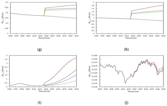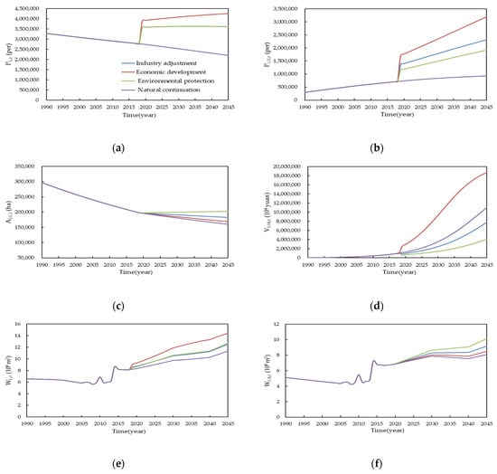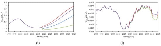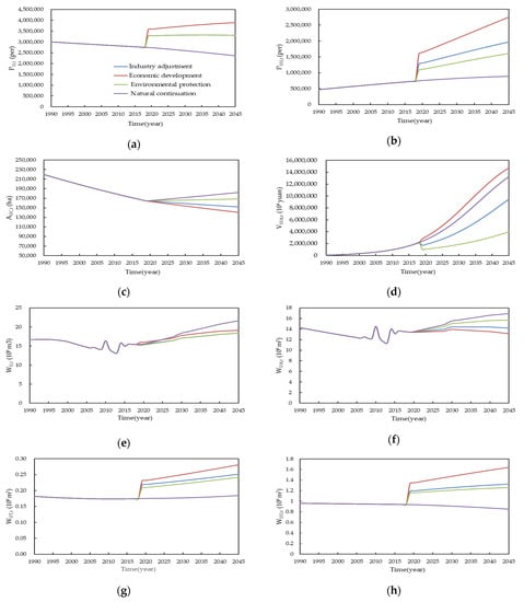 The simulation results are shown in Figure 4 and Figure 5. In both the upper and lower sections, the total water consumption shows an upward trend in all four scenarios. The greatest water consumption is by industrial and agricultural activities, accounting for more than 90%, followed by domestic water consumption, accounting for about 10%; the proportion of environmental water and tertiary industry water is the lowest. Because the parameters adopt the values in the scenarios after 2019, the simulated variables show jumps in Figure 4a,b,g,h and Figure 5a,b,g,h, respectively.