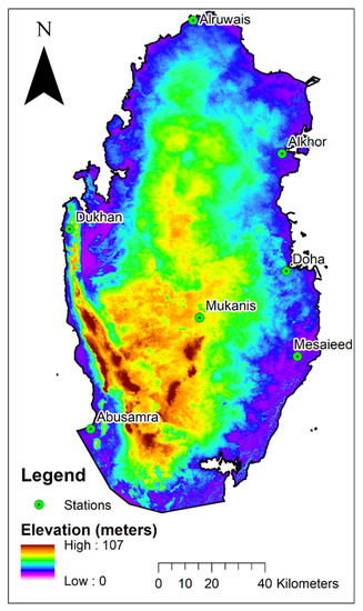 The State of Qatar is a peninsula located on the eastern coast of the Arabian Peninsula and is bordered by the Kingdom of Saudi Arabia to the south and surrounded by the Arabian Gulf in all other directions. The peninsula has an area of 11,571 km2, and it protrudes approximately 160 km into the Persian Gulf. Qatar is a relatively flat peninsula with natural topography that varies from 5 to 107 m above sea level (Figure 1). It has a hot desert environment and erratic annual rainfall. Qatar is often hit by Shamals, which are predominantly north-westerly dust storms that occur during the summer.
