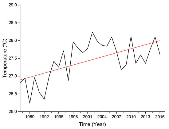 Mean temperature data from six weather stations from 1987–2016 were averaged to establish a state-wide representative mean annual temperature. Long-term temperature data indicated that the mean annual temperature in Qatar is 27.42 °C with significant variation between diurnal and seasonal temperature. Mean annual data were analysed using the Mann Kendall trend test with a confidence level of 95%. Mann Kendal trend test analysis indicated a significant (p < 0.005) increase in the state-wide mean annual temperature over the period of observation (Figure 2). The Sen’s slope estimated that mean temperature had increased by 1.02 °C over the last 30 years with a 0.034 °C per year increment. These warming trends are in agreement with previous studies in Qatar [21], Saudi Arabia [8] Iran [37], and Kuwait [9]. The Mann Pettit test indicated a significant change in the annual temperature data in 1997. According to The Oceanic Niño Index (ONI) by the National Oceanic and Atmospheric Administration, 1997 and 1998 were very strong El Nino years. Similarly, ENSO induced temperature intensities could be found in 2008–2009 and 2006–2007. La Nina signals were also obvious; for example, 2007–2008 and 2010–2011 were strong La Nina years (Figure 2).