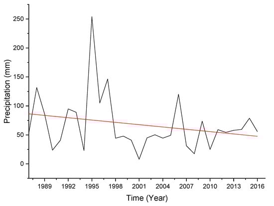 Rainfall data from six weather stations were also analysed for long-term trends using the Mann Kendall trend test with 95% confidence. State-wide long-term total annual rainfall data indicated rainfall is decreasing over the state of Qatar (Figure 3). It was determined that rainfall during the period of observation decreased by −0.42 mm per year. However, this decreasing trend was not statistically significant (p < 0.05). These drying trends are consistent with the subtropical drier projection [38]. More recently, similar dry episodes were observed in the MENA region [39,40] and particularly in Saudi Arabia [41].