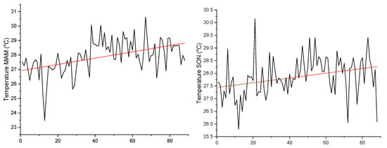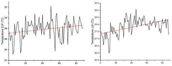 Mean temperature and total monthly rainfall data from six weather stations were divided into seasonal subsets; for example, winter (December, January, February = DJF), summer (June, July, August = JJA), spring (March, April, May = MAM) and autumn (September, October, November = SON) seasons. Seasonal data analysis demonstrated that mean monthly temperature during DJF (τ = 0.173, S = 0.016, p < 0.01), MAM (τ = 0.358, S = 0.02 (Sen’s slope), p < 0.0001), JJA (τ = 0.362, S = 0.011, p < 0.0001), and SON (τ = 0.335, S = 0.014, p < 0.0001), has increased significantly (p < 0.05) over the 30 year period of observation. As indicated by the Mann Kendall tau value, increasing trends are comparatively prominent during summer, spring and autumn (Figure 4).