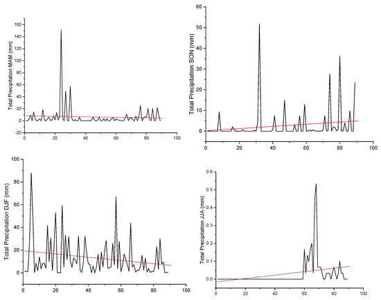 Similarly, total monthly rainfall was analysed for seasonal trends using the Mann Kendall trend test with 95% confidence. Annual rainfall in the State of Qatar is 70 mm based on the average data from 1987–2016. Most of the rainfall occurs during DJF and MAM followed by SON and JJA. JJA is usually dry with zero rainfall; however, in the recent decade, rainfall during JJA was increasing. Based on the Mann Kendall trend test, a statistically significant increment in the total monthly rainfall data was observed during JJA (τ = 0.453, S = 0, p < 0.0001) and SON (τ = 0.314, S = 0, p < 0.0001) (Figure 5). In contrast a nonsignificant downward trend in the total monthly rainfall was found during DJF (τ = −0.109, S = −0.045, p > 0.05), while a nonsignificant increasing trend was observed for MAM (τ = 0.047, S = 0, p > 0.05).