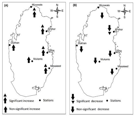 All six weather stations were also investigated for seasonal rainfall variation. The Mann Kendall trend test indicated great variability in seasonal temperature in DJF and MAM compared to JJA and SON. In DJF, none of the weather stations indicated a statistically significant increase in the monthly rainfall; however, a general nonsignificant decreasing trend was observed at five stations. As the temperature increases with the early warming in later February, monthly rainfall tends to increase with a significant increase at Dukhan weather station. In JJA, 80% of stations demonstrated a statistically significant increase in the total monthly rainfall. Similarly, 83% of stations indicated a significant upward tendency in the total monthly rainfall during SON. Though monthly rainfall increased significantly in JJA and SON, a significant amount of rainfall was received in DJF. Thus, decreasing trends in DJF is of importance compared to the observed significant increases in MAM, JJA and SON (Figure 8).