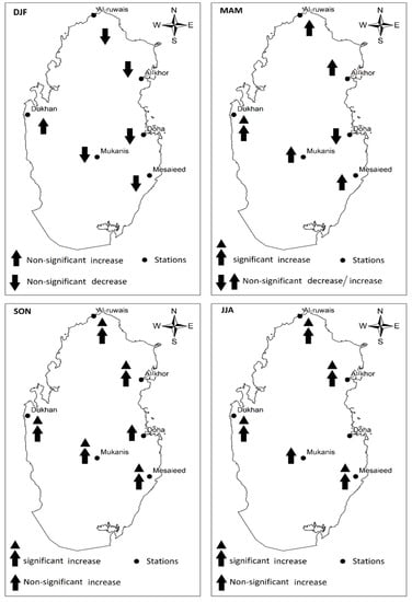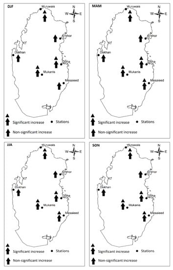 Data from six weather stations were analysed for seasonal trends in winter = DJF, spring = MAM, summer = JJA and autumn = SON. All weather stations indicated an increased temperature in the seasonal mean monthly temperature. However, 50% of the weather stations, namely Doha, Al-ruwais and Mukanis, indicated a significant increase during DJF. The number of weather stations with a significant increase in the monthly temperature further increased to 66.67% during MAM, JJA and SON (Figure 7). Most of these weather stations are installed in the eastern and southern coastal areas. In contrast, both the Al- Khor station installed at the eastern coastal line, and the Dukhan weather station situated at the western coastal line, exhibited nonsignificant increasing trends. This could be attributed to the geographic, climatic and anthropogenic changes in those areas.