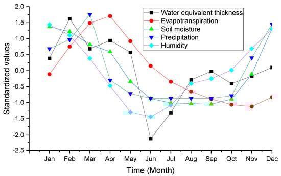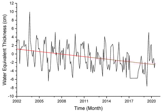 The Gravity Recovery and Climate Experiment (GRACE) satellite mission was cooperatively established and operated by the National Aeronautics and Space Administration (NASA) and the German Aerospace Centre (DLR). Gravity Recovery and Climate Experiment (GRACE) satellites operated from 2002–2017, and their replacement pair, the GRACE Follow-On, were started in 2018. The operation comprises two twin satellites in identical circular polar orbits at 500 km of altitude with a distance of 220 km between the two satellites. They measure differences in the earth’s gravitational field, which cause small fluctuation in the distance between both satellites as a result of different masses distributed on earth. These fluctuations are calculated by employing a GPS and a microwave sensing system giving spatiotemporal gravitational maps. Changes in the planet’s mass, shown as alterations in the gravitational field, are primarily triggered by fluctuations in surface and groundwater [25]. GRACE-based monthly gravity product produced by Jet Propulsion Laboratory (JPL) Monthly Mass Grids-Global mascons (JPL RL06_v02) were used in the present study. This monthly global mascon dataset contains gridded monthly global water storage information developed from GRACE and GRACE-FO. This dataset is available at https://podaac.jpl.nasa.gov/dataset/TELLUS_GRAC-GRFO_MASCON_CRI_GRID_RL06_V2 (accessed 27 March 2021) [26] in a single data file in netCDF format. This dataset has a spatial resolution of 0.5-degrees and a temporal resolution of one month. The current version of the data uses a Coastal Resolution Improvement (CRI) filter that decreases signal leakage errors across coastlines [27]. The water storage/height anomalies are given in equivalent water thickness units (cm) (NASA-JPL). Further details on the Mascon solution, involving the mathematical derivation, validation and realization of geophysical constraints can be found in [28].
