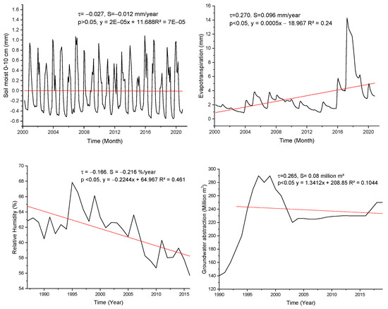 Evapotranspiration is the combined water loss by evaporation from the soil and the transpiration of vegetation. A shift in climate and weather parameters causes a significant change in evapotranspiration [45]. Changes in evaporation affect the soil moisture content and groundwater recharge. In addition, rising temperature increases evaporative demand over land, which limits the amount of water available to replenish groundwater [6]. Evapotranspiration data analysis indicated a significant increment (t = 0.272, p < 0.05) in evapotranspiration with an increase of 0.096 mm per year. The state of Qatar has sandy soil characterised by lower water-holding capacity. In addition, the significant increasing trend in mean temperature could be one of the main reasons for the observed decreasing trend in topsoil (0–10 cm) moisture. Furthermore, data analysis of relative humidity indicated a significant (p < 0.05) reduction over the last three decades with an annual decrease rate of −0.216 % (Figure 11). A significant inverse correlation (r = −763) was found between relative humidity and temperature. Relative humidity has an inverse relationship with air temperature as the temperature increases the water holding capacity of the air increases and the relative humidity decreases. This significant decrease in the relative humidity could be one of the reasons for the observed significant increment in mean temperature. Similar decreasing trends in relative humidity with an increase in the mean temperature were reported in Iran [46].