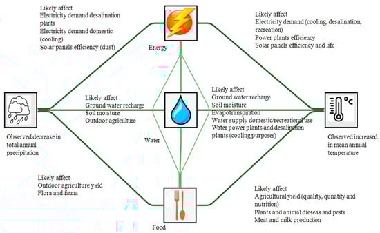 The observed significant increase in the mean temperature will affect the rate of evapotranspiration and soil moisture, which are vital parameters for crop growth. Variation in the mean temperature affects plants water requirements, as the temperature is directly related to evaporation and soil moisture loss. In dry conditions, plants require more water as soil moisture is evaporated into the atmosphere. This not only affects the soil moisture, which is vital for plant growth, but also groundwater recharge by reducing soil infiltration. In addition, a considerable amount of water is used for cooling during energy production. According to International Energy Agency, about 10% of the global freshwater withdrawals are for power generation [47]. Therefore, water demand for cooling purposes will increase in power plants and desalination plants if the increasing trends in mean temperature prevail in the future. Furthermore, power plants, solar cells and desalination power plant efficiency are likely to be affected by changes in mean temperature (Figure 12). Though the state of Qatar imports the majority of its food, fluctuations in the mean temperature is expected to affect local crop rotation, agricultural yield, and local meat and fish farming.