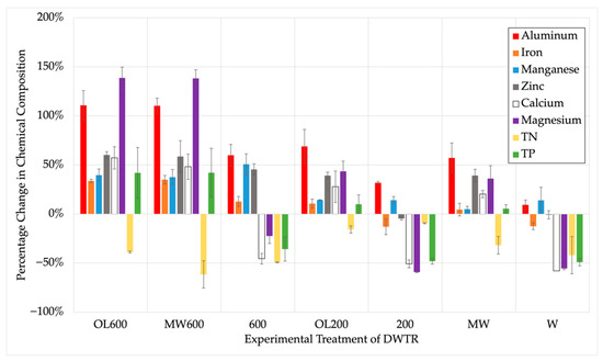 Average relative change (percentage) in concentration of metals and nutrients of two experimentally treated DWTRs (DP, UD) with bars representing the range in the average of the individual DWTR. Descriptions of treatments with abbreviations provided in Table 2.