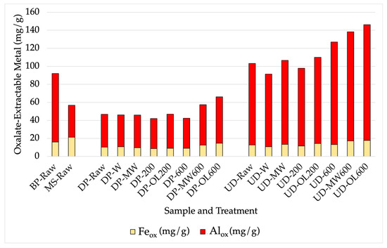 While the Al and Fe contents are generally important for P adsorption, adsorption is specifically related to the amount of Al and Fe that is in an amorphous (i.e., non-crystalline) form, as measured by Alox and Feox [20]. Overall, each of the DWTRs in raw and treated forms contained higher amounts of Alox compared to Feox, which can be expected because all four WTPs used Al-based coagulants (Figure 2). The total amount of Alox and Feox in the raw DWTR collected from DP was lower than the raw DWTR from UD, which was likely due to the type and amount of coagulant used. The UD WTP used alum (as opposed to PAC) and had higher turbidity, requiring higher coagulant doses. The results also showed that oxygen-limited heat treatments of 600 °C increased the contents of Alox and Feox in both DWTRs (Figure 2). On the other hand, washing and non-oxygen-limited heat treatments had no effect or marginally reduced the concentrations of Alox and Feox.