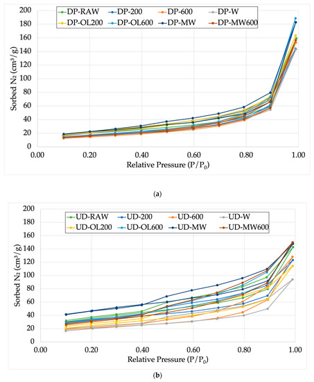 The adsorption/desorption isotherms for the DP DWTRs (Figure 3a) could be classified as reversible type II isotherms [50]. The isotherms indicated that the DP DWTRs were nonporous powders. On the other hand, the isotherms for the UD DWTRs (Figure 3b) could be classified as type II isotherms with type H3 hysteresis loops [50]. These hysteresis loops indicated some interconnected pores with narrow bottlenecks.