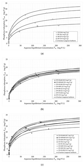 P sorption batch experimental data fitted with two-surface Langmuir isotherms for: (a) four air-dried DWTRs without treatment; (b) one air-dried and seven experimentally treated DWTRs from DP WTP; (c) one air-dried and seven experimentally treated DWTRs from UD WTP. The values in parentheses represent the total P sorption capacity (b).