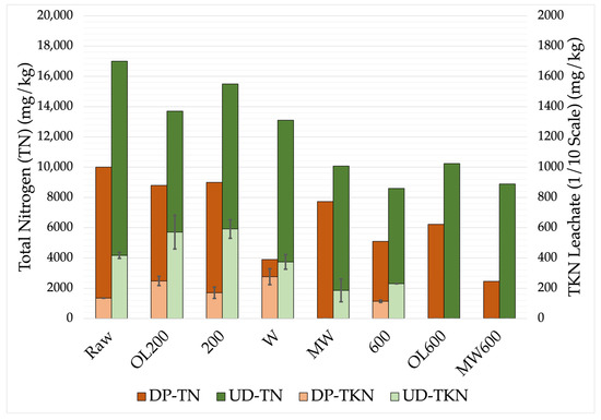 Total nitrogen (N) of DP DWTRs (brown) and UD DWTRs (green), as plotted on the left-hand y-axis. The average amount of N, measured as TKN, that leached from the DWTRs during leaching experiments is shown in lighter colors on the right-hand y-axis (at 1/10 scale to TN). Bars represent range of TKN values (n = 3).