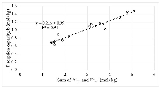 Despite considering several physio-chemical properties, the overall P sorption capacity (sum of b1 and b2) was well described (R2 = 0.94) by a single parameter: the sum of Alox and Feox (Figure 6). Collectively, these results suggest that the sorption kinetics and necessary concentration gradients are mediated by the pore structure and presence of occupied sorption sites.