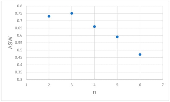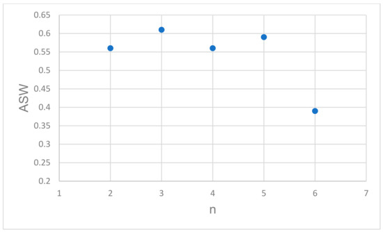 In Figure 1, the variability among the silhouette maps is portrayed in order to facilitate the visual evaluation of favorable cluster groupings; they range from 2–6 memberships. Dataset silhouetting provides an easy cluster cohesion evaluation, since larger score values are indicating better matching with their own cluster and better separation from their neighboring clusters. To quickly screen for an optimal membership number, the volatility of the silhouette bands is depicted in terms of the proper performance measure—the ASW—against the predefined number of tested clusters, n (Figure 2). Clearly, it may be inferred that working with a three-clustered dataset will be advisable, since the ASW value is maximized at a value of 0.61. At this point, it is needed to “de-nominalize” the membership identification of the Abu-Shady ED dataset (Tables 3 and 4 in reference [22]). The nominal representation of the dataset according to the silhouette method results, for n = 3, is listed in Table 1. The de-nominalization/ordinalization path is recoded as: 2′→3, 3′→2, and 1′→1, where the primed cluster identification represents the nominal status (initial cluster assignment).