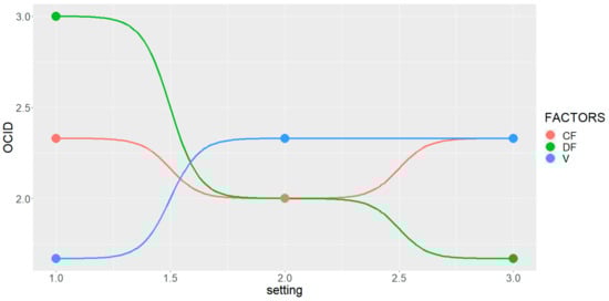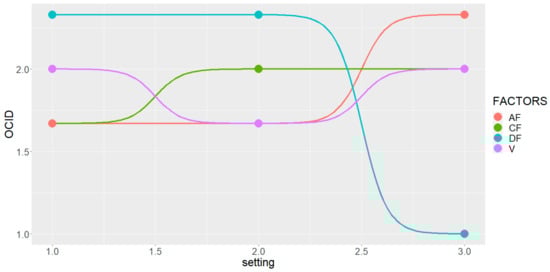 To justify the reason for a “re-engineered” designation (from cluster nominal labeling to ordinal ranking), the notion is illustrated by providing (Table 2) useful descriptive statistics that estimate the initial central tendencies of the nominally labeled datasets. It becomes clear that if it is to maximize RS (mean = 13.41%), and minimize SAR (mean = 5.33) and SSP (mean = 62.29%), their performance is maximized at a ranking of value ‘3’ (the highest achievable). Hence, the nominal labeling of ‘2’ becomes the ordinal ranking of ‘3’, i.e., the maximum desirable behavior for all three water quality indices. It becomes apparent now why the nominal rating of ‘1’ should remain unaltered to the original designation. Hence, it simply remains to become the ordinal ranking of value ‘1’—least desirable behavior by all three characteristics. From Table 2, it is observed that the evaluated measures of the central tendencies are fairly stable; mean and median estimations are similar in consideration of this small sample. The next step is to use as a guide the L9(34) OA setup of the Abu-Shady ED dataset (Table 3 in ref. [22]) along with the OCID dataset from Table 1 so that to prepare a bump chart (Figure 3). The versatility of the bump chart is conveniently demonstrated in the depiction of the uniformed multiple-ranking performances of the factors and their quick tracing of changes across settings. It immediately becomes evident that the variable factors should be treated with a linear model. The fitted model will be further simplified if factors CF, AF and V are outrightly eliminated, since no significant disturbance is detected—fluctuations around any ordinal level are less than half-step. On the contrary, factor DF seems to cause enough attenuation to span across two adjacent ordinal levels. It is construed that the DF variable should be treated with a simple linear model, as observed by the fact that between levels ‘1’ and ‘2’ there is no fluctuation at all. Finally, using ordinal regression with DF to play the role of the single predictor, it is discovered that DF is statistically significant at a level 0.5 upon while meeting absolute and relative convergence criteria.