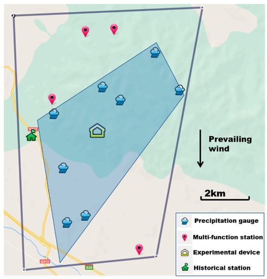 Wushaoling is located in the middle of Tianzhu Tibetan Autonomous County, Wuwei City, Gansu Province, southeast end of the northern branch of Qilian Mountains. Topographically, Wushaoling is located at the intersection of the Loess Plateau, the Qinghai-Tibet Plateau, and the Inner Mongolia Plateau, with a length of 17 km and an average elevation of 3562 m. Climatically, sub-arid, mid-temperate sub-arid, and mid-temperate arid zone intersect in Wushaoling. The east of Wushaoling is the monsoon region with outflow, and the west is the non-monsoon region with inflow. The main source of surface runoff replenishment are precipitation and melting ice and snow, with a great interannual variation. There is an updraft at the site. Abundant moisture input is provided compared with the surrounding area. Taking power supplies, traffic, and other factors into account, the site in Wushaoling is located on the top of Maomao Mountain, relatively close to the local meteorological station. The site is installed on the windward slope of the airflow, indicating that the charged particles would be transported easier to the cloud layer. A satellite map of the Wushaoling area is shown in Figure 2, with the experimental devices and precipitation gauges labeled.