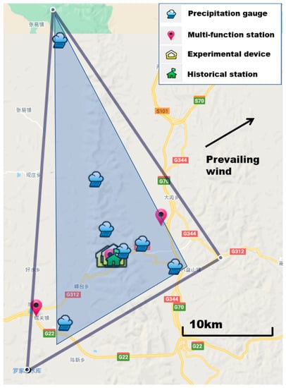 To better evaluate the actual effect of cloud seeding, meteorological monitoring instrument networks were designed and constructed in both experimental areas to provide a higher temporal and spatial resolution of the precipitation and other meteorological characteristics. Previous studies based on historical meteorological data indicated the dominant wind direction of the experimental area [22]. It is assumed that the charged particles spread with the airflow. Thus, the meteorological monitoring instrument network is mainly constructed downwind the ionization system. The meteorological monitoring instrument networks consist of rain gauges and multi-function stations. The specific locations of these multi-functional stations are shown in Table 2. Since both trial areas are located on a high altitude, the temperature is often below 0 °C. Therefore, solid precipitation measurement gauges have also been installed with the multi-function stations. Data collected by the meteorological monitoring instrument networks can be obtained through web or directly from the database. Meteorological characteristics and their resolution are shown in Table 3.