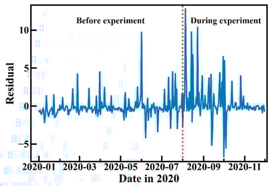 A residual plot is analyzed, which represents the difference between the actual and predicted values of the average daily precipitation in 2020, as shown in Figure 5. As can be seen from the graph, the variation of the residuals in the first half of the year is relatively smaller and stays around the value of 0. The variation in the second half of the year is larger, while mostly positive, showing that the actual precipitation in the second half of the year is generally greater than the predicted value, which is likely brought by the trial.
