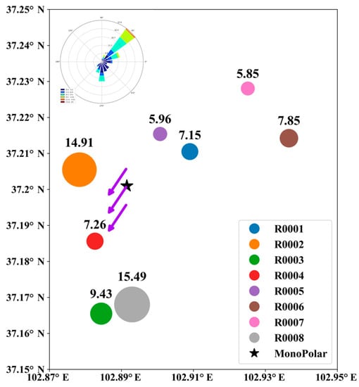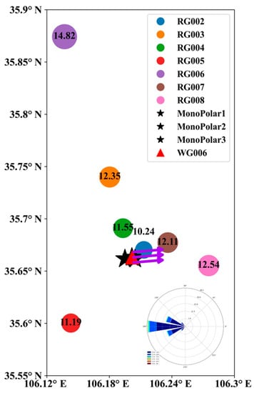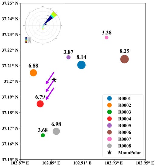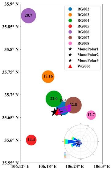 The first is the Wushaoling area. Figure 12 and Figure 13 respectively show the rainfall and wind maps for the device off (August 4) and on (September 21) in Wushaoling. The circles in the graph represent the locations of the precipitation stations, the size of the circles represents the amount of precipitation, and the values indicate the specific values of precipitation. The wind direction is almost the same for both days shown in the graphs, which means that the division between upwind and downwind stations is the same for both days. This makes it possible to see the catalytic increase at a particular station by comparison. The analysis is then combined with whether the station is upwind or downwind to reveal the difference in the effectiveness of upwind and downwind catalytic precipitation augmentation.