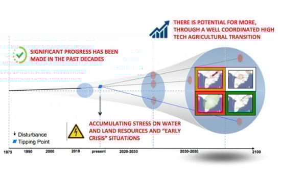 The first case study is the Mekong Delta Plan (MDP) in Vietnam. The formulation of the MDP was completed in 2013, which was the result of the bilateral water cooperation between the Vietnamese and Dutch governments (Government of the Netherlands and Government of Vietnam, 2013). The MDP was developed by a group of Dutch experts and consultants and Vietnamese former civil servants and experts [] The MDP serves as a strategic recommendation, which sets socio-economic scenarios and recommends strategic delta measures under the motto ‘toward a resilient urban delta’ in Vietnamese delta and water management, suggesting transitioning towards an ‘agro-business industrialization scenario’ (see Figure 2). This scenario is illustrated in the Figure 2, which highlights the future development of Vietnamese delta management to overcome existing stresses in water resources and land use management. This development path requires well-coordinated planning and high-tech agriculture development. Although the document was not formalized in the Vietnamese administrative systems, the strategic recommendations from the MDP resonated among international development parties and provided a reference for the upcoming delta development projects with international funding (such as Government Resolution 120 on Climate-Resilient Mekong Delta). This paper focuses on the development and implementation of the MDP as the action-situation for the policy transformation to resilient delta management. The MDP is the first Delta Plan developed outside the Netherlands and is based on the Dutch Delta Program 2008.