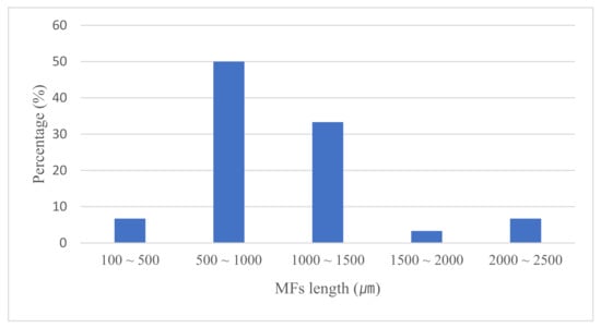 The amount of untreated MFs per one garment released in the washing drainage was 148 ± 21 MFs/L, which was equal to 85 ± 12 MFs/g on a weight basis. This value was similar to that observed in other, previous studies (82.6 and 78.1 MFs/g) [11,13]. We expected that the length of MFs contained in the drainage would be less than 300 μm owing to the 300 μm built-in sieve in the washing machine that filtered the drainage. However, 97% of the detected MFs were over 300 μm, indicating that flexible MFs can easily pass the 300 μm sieve screen. The most frequently detected size of MFs was in the range of 500–1000 μm in length with a median value of 957 μm and a maximum MF length of 2114 μm (Figure 1). Thus, this indicates that the MFs generated in the process of laundering in a real environment may have various lengths, regardless of the built-in sieve size in the washing machine.