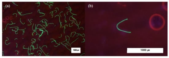 Since its invention, plastic has been incorporated into many products due to its convenience, thereby increasing the use of plastic dramatically [1]. The generation of plastic waste has increased in recent years, leading to 4.8–12.7 million tons of plastic discharging into oceans every year because of waste mismanagement [2]. Microplastics are less than 5 mm in size and can be generated by plastic wastes introduced into the environment, which undergo pyrolysis and physical and chemical transformations, by which they are decomposed and fragmented into smaller particles [3,4]. Such microplastics have been detected in the form of films, flakes and fibers and, of these, microplastic fibers (MFs) are commonly detected in all aquatic environments, such as lakes, rivers, oceans and marine sediments [5,6,7,8,9,10].