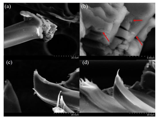 SEM images of cut edge of the PE garments: (a,b) fibers broken by physical forces after washing; (c,d) cut by scissors.
