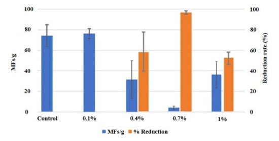 Number of MFs from the untreated control and percent reduction with chitosan pretreatments at various concentrations.