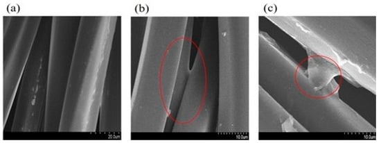 Compared with the control, the fibers in the chitosan pretreated samples were well connected with each fiber by the chitosan solution (Figure 5). Thus, this indicated that the application of chitosan solution may link each fiber and reduce the generation of MFs. To be more specific, chitosan particles adhere to the fabric surface through linear bonding with the carboxyl group of chitosan and the terminal group of PE fabric, thereby increasing the tensile strength between each fiber [25]. When the samples were pretreated with a 0.7% chitosan solution, the coating was mostly uniformly formed on the MFs (Figure 5b), whereas the films on the MFs of the sample treated with 1% chitosan solution were not uniform because of film sagging (Figure 5c). Thus, it appeared as a non-uniform and thick-layered coating due to excessive chitosan concentration used. Therefore, it was confirmed that the chitosan coating was more uniform at a moderate concentration (0.7%) than at the highest concentration (1.0%); further, it was observed that the chitosan coating formed evenly with the 0.7% chitosan solution. Thus, the uniformity of the chitosan coating may be a key factor to reduce MF emissions from the laundering process. Optimal chitosan concentration may highly rely on the area/weight of garments; thus, further research on the optimal conditions for various areas and weights of garments is required.